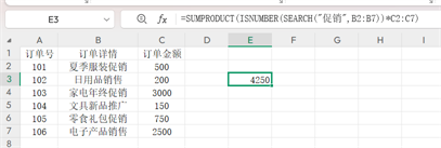 =SUMPRODUCT(ISNUMBER(SEARCH(“促销”,B2:B7))*C2:C7),通过ISNUMBER(SEARCH())来生成逻辑数组。