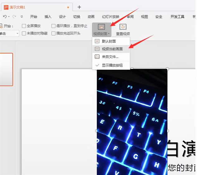 步骤1:如图所示,点击插入选择视频,将一段视频插入PPT。然后按Shift键保持视频长宽比,拖动调整到适当尺寸和位置: