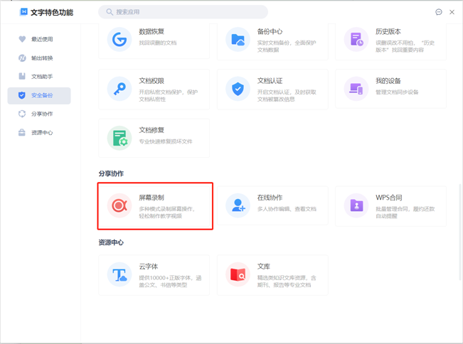 在软件顶部的菜单栏中,先点击【会员专享】,接着在展开的功能列表中点击【更多】,之后可以通过搜索功能查找,也能在【分享协作】分类中找到【屏幕录制】选项。