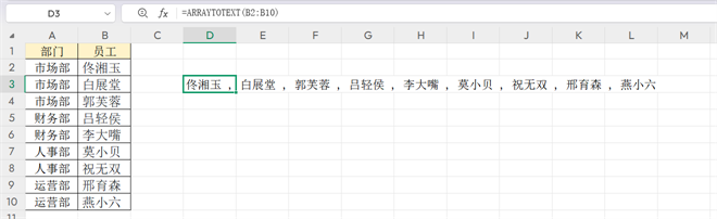 最后,确认合并结果,按下回车键后,D3单元格就会显示出所有的姓名,这些姓名默认用逗号分隔,整体格式十分整齐。