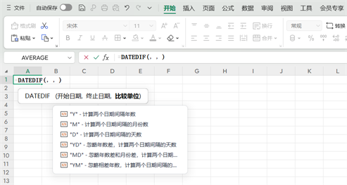 - “YM”:抛开年份和天数的差异,只计算两个日期的月份间隔数。例如2024/1/7和2025/2/10,仅看1月到2月,结果为1个月。