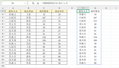 举个例子,如果有一个表格在A1到D17这个范围内,现在想要提取其中的第1列(也就是A列)和第3列(也就是C列)的数据,直接在单元格里输入“=CHOOSECOLS(A1:D17,1,3)”,就能立刻看到提取后的结果。而且这个函数是动态的,要是原表格里的数据有了变化,比如修改了某个单元格的内容,提取出来的结果也会跟着自动更新,不用再重新操作一遍。