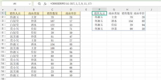 比如说,要从A1:D17这个表格里提取第1行(表头)、第2行、第9行、第11行和第17行的数据,输入“=CHOOSEROWS(A1:D17,1,2,9,11,17)”,这些行的数据就会立刻显示出来。这个函数也是动态的,当原表格里的数据有增加、减少或者修改时,提取出来的结果会自动跟着变化,不用再进行第二次操作。