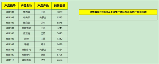 此次测试选用了产品销量统计表,包括不同产地的产品以及它们的销售数量。我们的需求是:统计出产地为江苏、且销售量在5000及以上的产品有多少种。