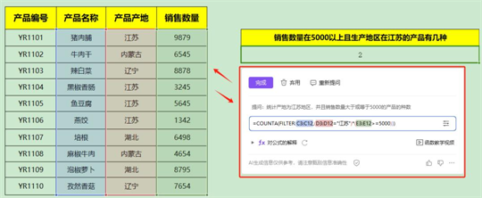 在对话框中把需求清晰地描述出来:“统计产地为江苏地区,并且销售数量大于或等于5000的产品的种数”。点击发送后,AI很快就生成了公式: