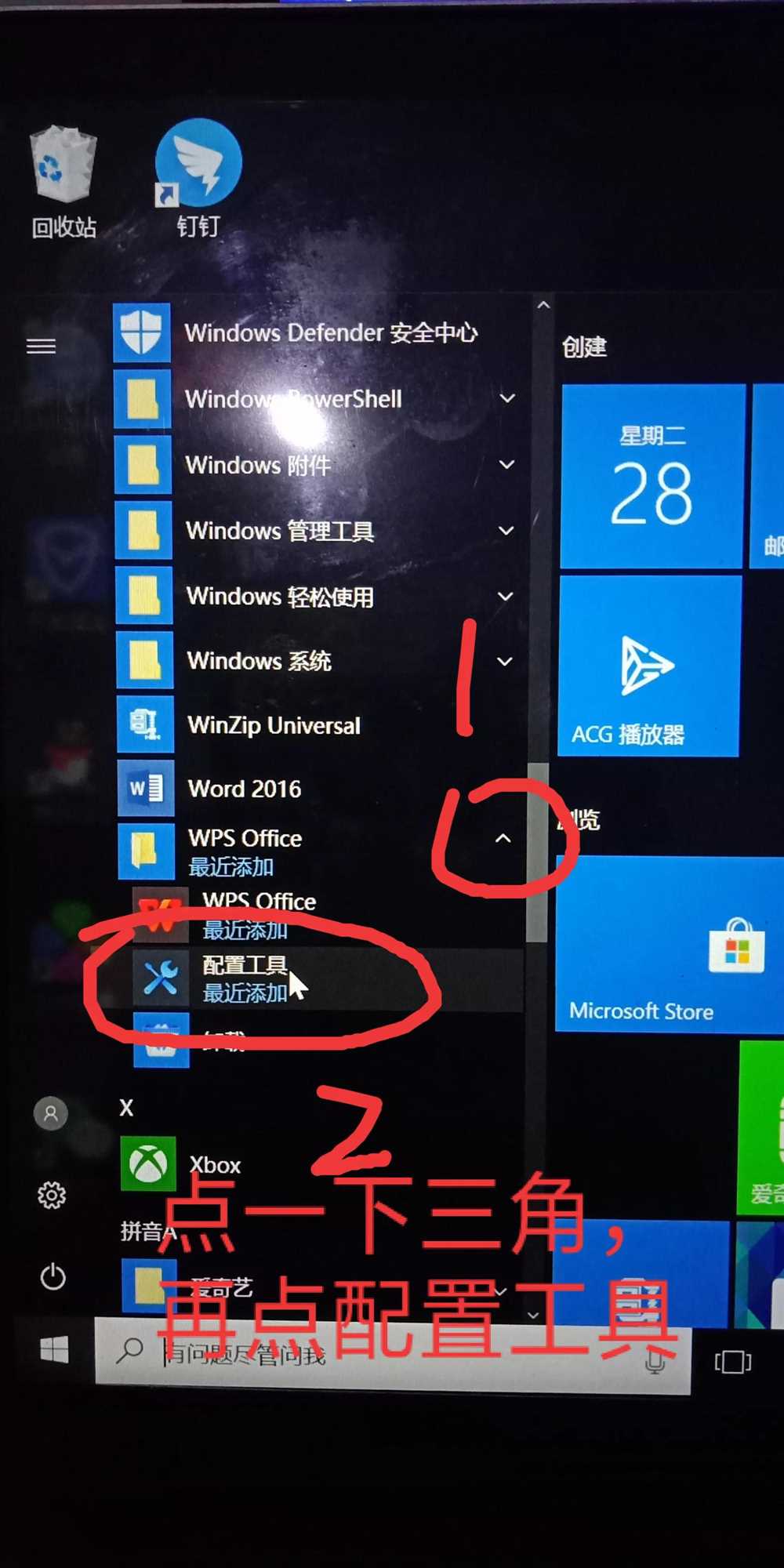 4.在WPS Office文件夹右边的小三角上,点击一下左键,就会出现配置工具。