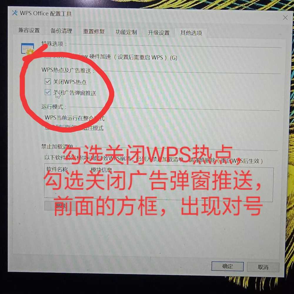 点击“关闭WPS热点”和“关闭广告弹窗推送”前面的方框,关闭WPS广告