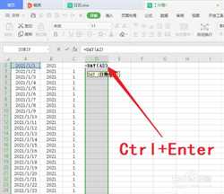 9.同理计算”日“列,输入公式:=DAY(A2),按”Ctrl+Enter“,填充所有已选的单元格;