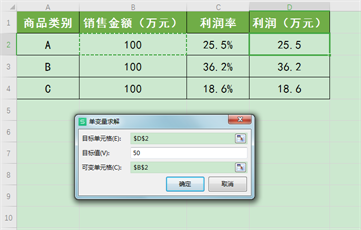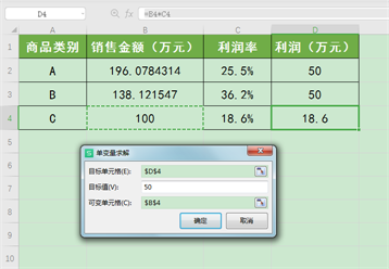 7.计算C类商品实现50万元利润时要达到的销售额。选中D4单元格,按照前面所述的办法,打开“单变量求解”对话框。在对话框中设置“目标单元格”为“$D$4”,“目标值”为我们想要实现的利润“50”,“可变单元格”为“$B$4”,最后单击“确定”按钮。