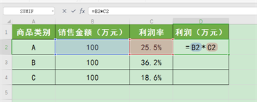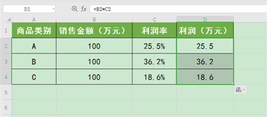 - 在D列单元格中设置好计算公式。选中D2单元格,输入公式“=B2*C2”,按回车键确认,再将公式向下填充至D4单元格。