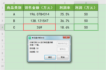 接着在弹出的“单变量求解状态”对话框中单击“确定”按钮。可见工作表中B4单元格的数值已变为“269”,即C商品要实现50万元利润应达到的销售金额。