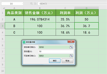 6.计算B类商品实现50万元利润时要达到的销售金额。选中D3单元格,按照前面所述的办法,打开“单变量求解”对话框。在对话框中设置“目标单元格”为“$D$3”,“目标值”为我们想要实现的利润“50”,“可变单元格”为“$B$3”,最后单击“确定”按钮。