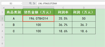 5.此时,可见工作表中B2单元格的数值已经发生相应的变化,变为“196.0784314”,即A商品要实现50万元利润应达到的销售金额。