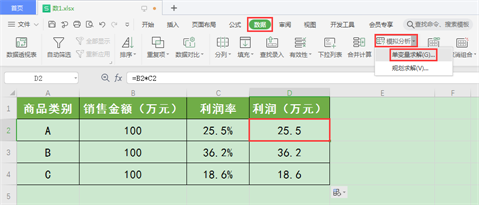 最佳答案应用案例下图工作表中显示了“A”“B”“C”三类商品的销售金额、利润率、利润等相关数据信息。其中,每类商品的利润率(参见C列)保持不变,接下来我们通过单变量求解计算三类商品的利润达到50万元时分别要达到的销售金额。操作步骤在D列单元格中设置好计算公式。选中D2单元格,输入公式“=B2*C2”,按回车......