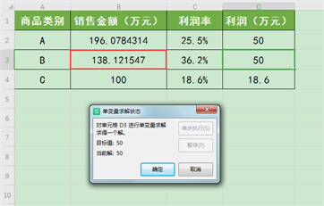 接着在弹出的“单变量求解状态”对话框中单击“确定”按钮。可见工作表中B3单元格的数值已变为“138.121547”,即B商品要实现50万元利润应达到的销售金额。