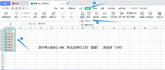 首先,打开WPS表格,新建一个空白文档,在A1到A8单元格中输入需要排序的字母数字混合内容(例如“AB-12-34”“CD-56-78”等,要保证格式统一,用特定符号将字母和数字分隔开)。输入完成后,选中A1到A8的单元格区域,点击顶部菜单栏中的“数据”选项,在下拉菜单里选择“分列”功能,以此启动数据拆分工具。