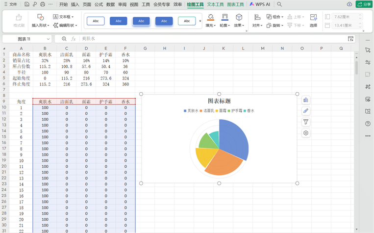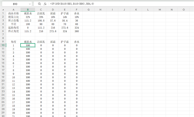 首先,把原有表格数据调整为横向排列,新增“所占份数”行,在单元格中输入公式“=B2*360”,将数据比例转化为对应的角度数值。接着设置“半径”行,首个单元格填入100,后续单元格依次按10的差值递减,这些数值可根据实际展示需求灵活修改。