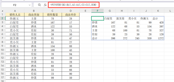 应用场景:按“商品类别”(行)统计“销售人员”(列)的销售数量总和。