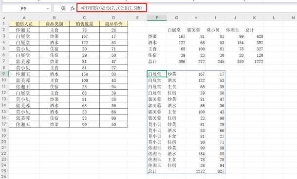 第一个参数:A1:B10(两列行字段,实现“销售人员→商品类别”的层级分组)