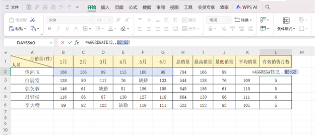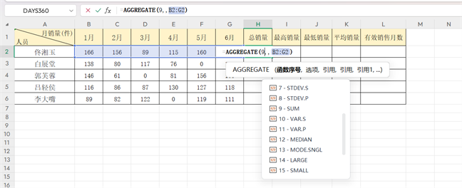 以包含6个月销量的人员销售表为例,用AGGREGATE函数完成5项关键统计,操作如下: