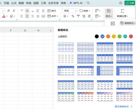 1.选中要美化的表格区域,在顶部菜单栏点【开始】,找到【表格样式】按钮点击,即可打开样式面板。