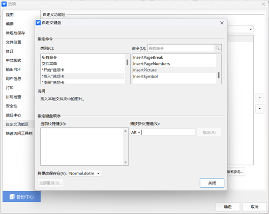 最佳答案一、进入快捷键自定义界面要开启自定义之旅,先打开WPS文档,点击左上角「文件」,在下拉菜单中选择「选项」。进入设置窗口后,找到「自定义功能区」,在窗口下方「键盘快捷方式」板块点击「自定义」,即可进入快捷键配置界面。二、自定义功能快捷键设置以设置「插入图片」的快捷键为例:在配置界面左侧「类别」列表中选......