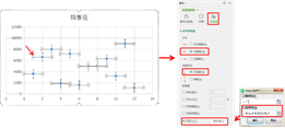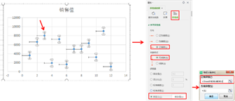 选中X轴的误差线,快捷键”Ctrl+1″误差线选项,水平误差线方向为”负误差”,末端样式”无线端”,误差量”自定义”,负错误值选择辅助列1(C2-C13)的数据。