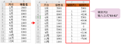 在原始数据基础上,添加辅助列1,C3-C13单元格输入数值1,添加辅助列2,D2单元格,输入公式“B3-B2”,依次填充,到D12单元格结束。