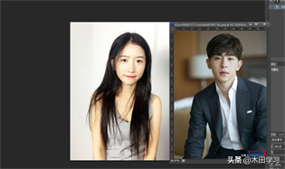 1、用Photoshop软件打开需要换脸的两张照片,用矩形选框工具,将男生的脸部框选出来,然后用移动工具,将男生脸部选区移动到女生照片中