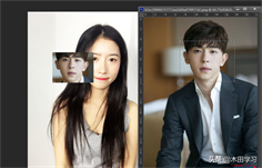 2、回到女生照片当中,移动男生脸部图片至女生脸部上面呈覆盖状态,并在图层面板设置男生脸部图片的不透明度为65%,按住ctrl+t对男生脸部图片进行自由变换,放大至完全盖住女生的脸部(最好是两张图片的眼睛部位重合),然后将不透明度调回100%,按住回车键确认变换