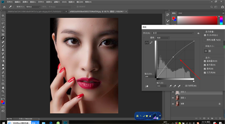 三、回到图层界面,选择图层1,ctrl+j扣出从选取部位,然后我们ctrl+M调出曲线,选中间灰度向高光反向拉一点。注意不要拉得太大,看图像,只要图像斑点大部分全部去掉就行了。拉得太多,人丢失人物脸部的很多细节,这样就失真了。