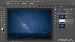 选择上面的星空图层,执行“Ctrl+J”复制一个图层,图层混合模式更改为“变亮”。