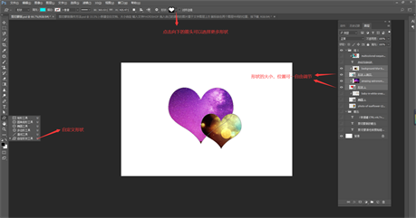 >选择工具栏上的自定义形状工具,选择心形