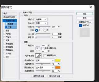 Step04 按快捷键Ctrl+J将“图层1”复制,并将得到的图层命名“纹理”。双击“纹理”图层,在打开的“图层样式”对话框中勾选“斜面和浮雕”复选框,并在右侧面板中调整“结构”与“阴影”的参数,如图所示。