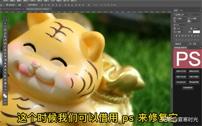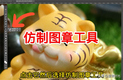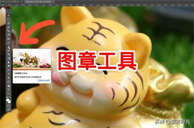 大家仔细看下这张图片,检查存在哪些缺点,这只小老虎的主要瑕疵就是印刷的图案有残缺,不完整,还有局部的反光,我们可以使用这个【图章工具】来修复它,图章工具的旁边有一个小三角形,点击它,然后选择【仿制图章工具】。