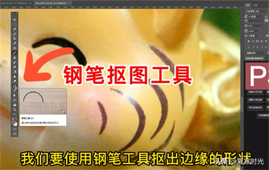 像这种有弧度的图案,我们要使用【钢笔工具】抠出边缘的形状,将这个区域选取出来之后,然后再进行修复,这样才不会影响相近的区域。(关于这个工具,我会在下一篇文章进行详细的讲解)。