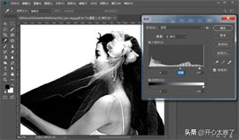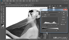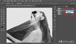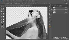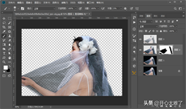 添加蒙版,用黑色画笔涂抹隐藏头纱上面的透明区域。涂抹的过程中按“{和}”快捷键调整画笔笔触的大小,不要涂抹到多余的区域。多涂的区域用白色画笔涂抹修复。