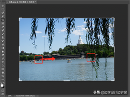 使用拉直功能十分简单,只需要在图像中找到应该是直的对象。单击拉直图标后在对象上画一条线,然后 Photoshop 就会使用该线的角度来自动旋转和拉直图像。比如案例中水面线应该是水平的。单击拉直图标后单击水面线的左边,为这条线设置一个起点,然后按住鼠标拖动到水面线的右边设置终点。这时 Photoshop 会在两点之间画出一条细长的直线。