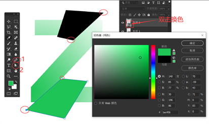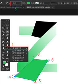 按住(2)处不放,选择直接选择工具,框选要调整的投影区进行调整,尽量与Z字母斜线打保持平行,尽量不要破坏字的整体结构