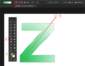 选择渐变色工具(2)在前景色(1)中设置颜色,在(3)处选择渐变类型,最后在起点(4)左键按下,拉到(5)渐变色结束点,完成渐变,