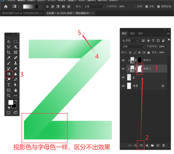 选择(1)处理的投影块层,在(2)处理单击图标,为其添加图层蒙板,选择渐变工个(3),在(4)处按下不放,沿箭头向(5)处理完成渐变