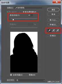色彩范围右边的三个吸管工具,第一个是进行颜色取样的,第二个加选颜色,第三个减选颜色。调整颜色容差的数值,直到选出人物主体以外的区域。点击“确定”后返回。