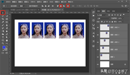 拖入刚才制作好的一寸证件照,按住“Alt”键拖动照片,复制4个。按住“Ctrl”键选择这5个照片图层,选择“移动工具”,点击“垂直居中对齐”、“水平分布”进行对齐操作。