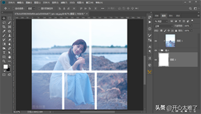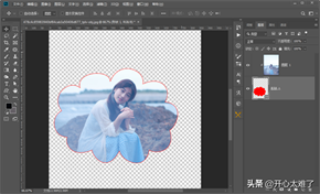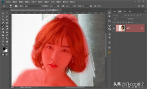 快速蒙版有两个打开方式,一是点击上图红色圆圈起来的图标,二是按快捷键“Q”,打开快速蒙版以后,图层显示红色,表示已经进入快速蒙版编辑状态。