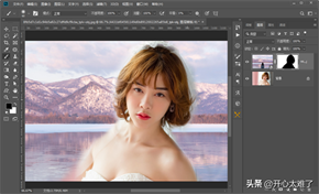 如上图所示,在图层上添加图层蒙版。图层蒙版的特性是黑色区域隐藏当前图层图像,白色显示当前图层图像,灰色呈现半透明效果。明白这个原理,就可以用画笔工具对图层蒙版进行黑色或白色涂抹操作。也可以调整画笔工具的透明度,画出半透明的效果。渐变工具同样适用于图层蒙版。