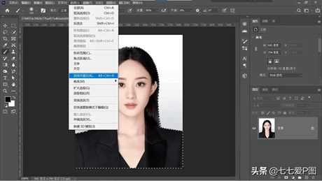 1.打开一张证件照,选择菜单栏的选择→主体,点后会有虚线。(虚线是选择的内容,快速选择工具,魔棒工具也可以,注意不要选择到背景,选择到背景可以用Ctrl+shift+I进行反选)