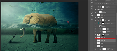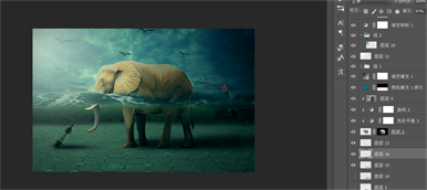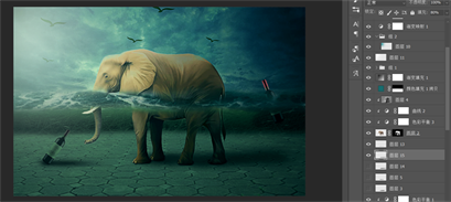 这里大象的阴影,就没有办法用上边的操作了,只能根据光的角度来一点点的画了,我们首先来做比较实的,像刚才那样,用黑色画笔把大象脚的部位先做一下。