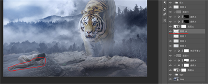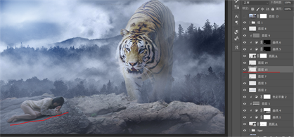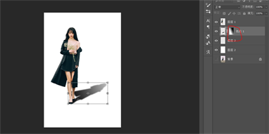 但到这一步还远远不够,脚下的阴影是比较实的,我们这样模糊处理后其实是把人物脚下的阴影也给虚化了,这是不可取的,因此我们需要在人物图层下新建图层,然后用黑色画笔在脚下的边缘稍微涂抹一下。