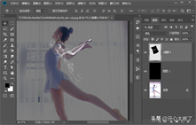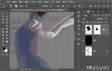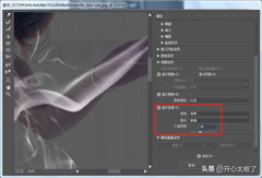 3、观察照片人物的形态,分解成几个部分。拖进来一个和人物某一部分大概契合的烟雾素材,更改图层混合模式为“滤色”,祛除烟雾黑色的背景。执行“Ctrl+T”自由变形工具,调整烟雾的形态,让它和人物更契合。因为这张照片色彩太浅了,烟雾不清楚。为了看清楚烟雾,所以我把观察图层打开了,并降低图层的不透明度。