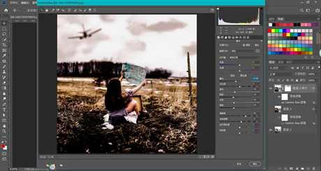 3.改变照片的暖色调,压低色调曲线中的红色通道曲线,减少HSL中的色相,饱和度,明亮度中的黄色参数(照片中黄色像素较多)。
